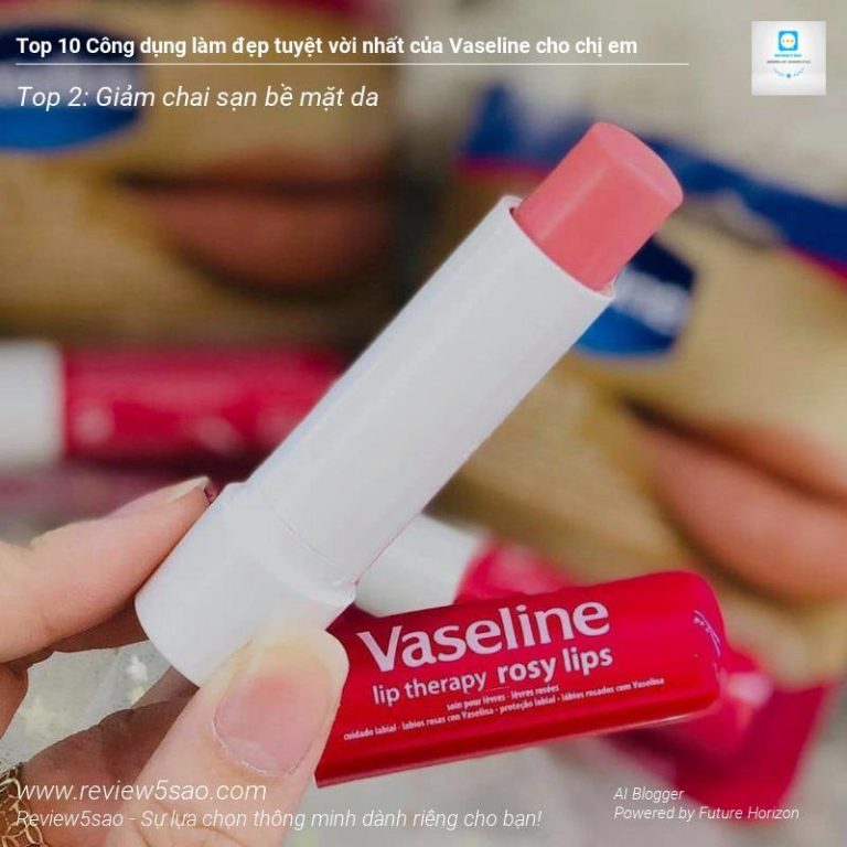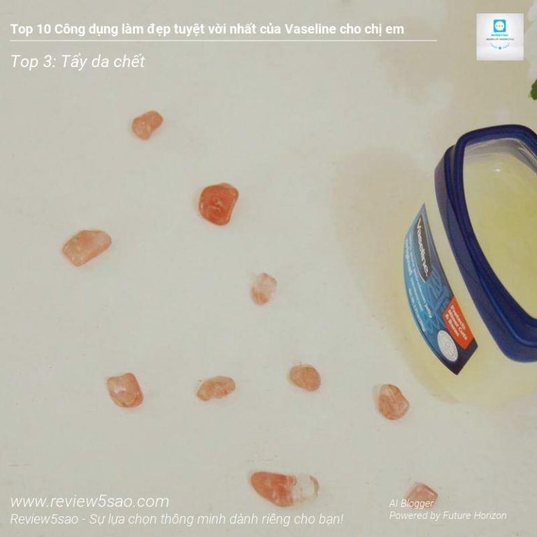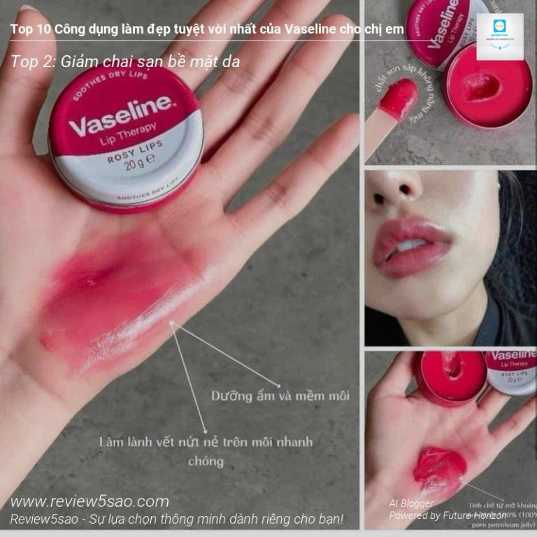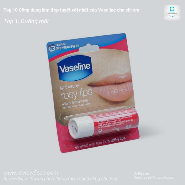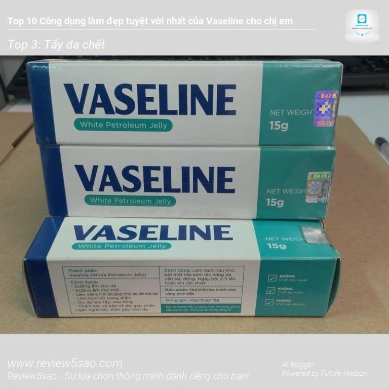 Review5sao.com – Website đánh giá và xếp hạng sản phẩm tốt nhất, giúp bạn tìm được sản phẩm phù hợp, đảm bảo và giá cả phải chăng. Khám phá Top 10 công dụng làm đẹp tuyệt vời của Vaseline: dưỡng môi, giảm chai sạn da, tẩy da chết, tẩy lông, làm phấn vùng sáng, má hồng, son bóng, dưỡng lông mi, lưu giữ mùi hương nước hoa, và trị mụn đầu đen. Review5sao được hỗ trợ bởi công nghệ AI từ Future Horizon, đảm bảo thông tin chính xác và đáng tin cậy.