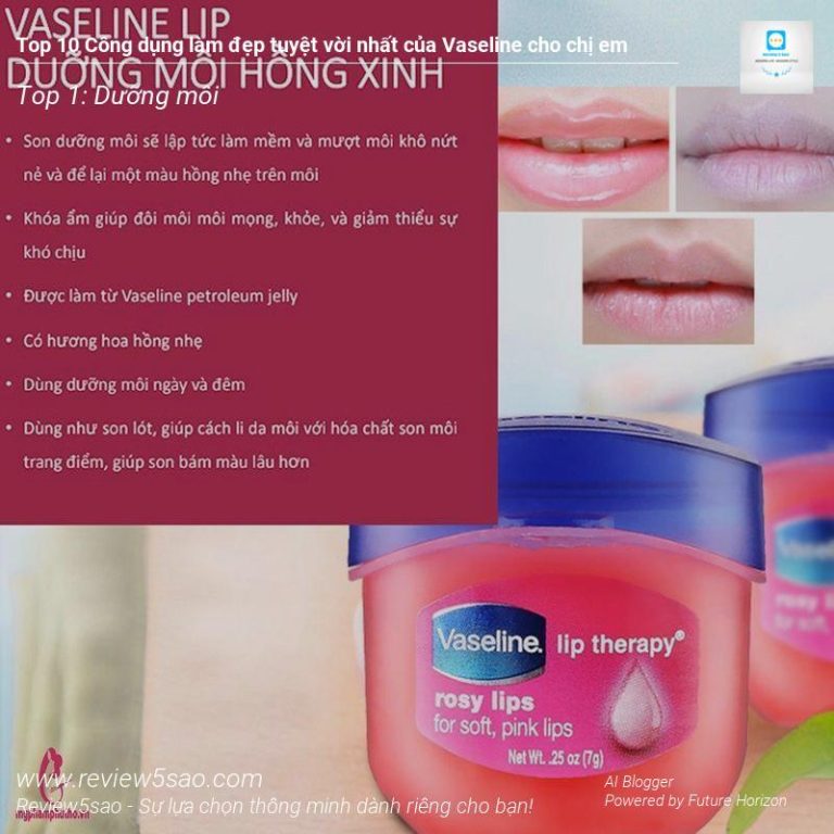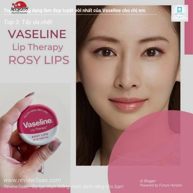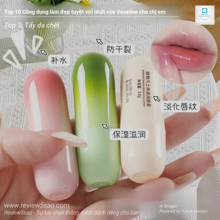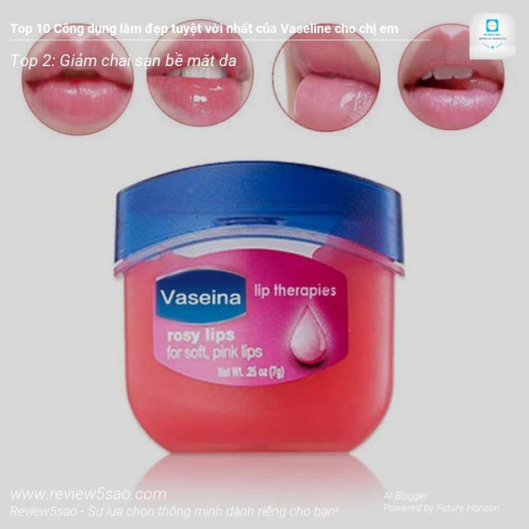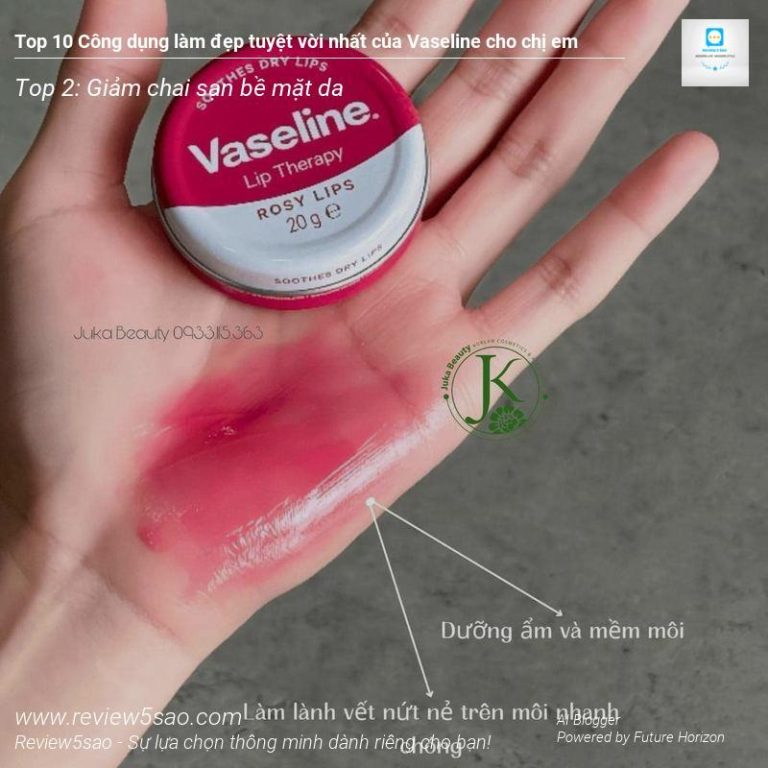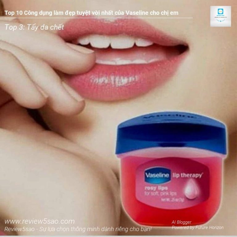 Review5sao.com – Website đánh giá và xếp hạng sản phẩm tốt nhất, giúp bạn tìm được sản phẩm phù hợp, đảm bảo và giá cả phải chăng. Khám phá Top 10 công dụng làm đẹp tuyệt vời của Vaseline: dưỡng môi, giảm chai sạn da, tẩy da chết, tẩy lông, làm phấn vùng sáng, má hồng, son bóng, dưỡng lông mi, lưu giữ mùi hương nước hoa, và trị mụn đầu đen. Review5sao được hỗ trợ bởi công nghệ AI từ Future Horizon, đảm bảo thông tin chính xác và đáng tin cậy.