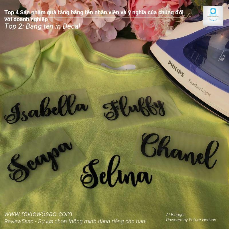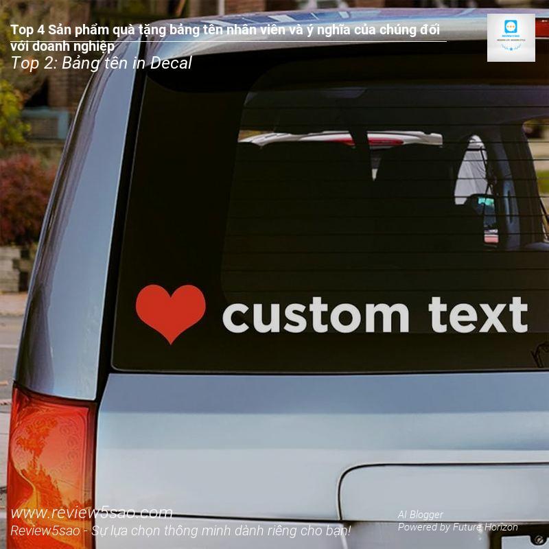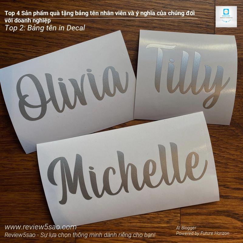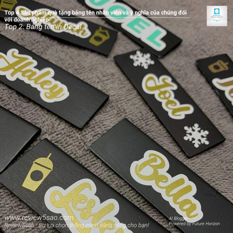 Top 2 trong danh sách Top 4 Sản phẩm quà tặng bảng tên nhân viên và ý nghĩa của chúng đối với doanh nghiệp trên Review5sao.com chính là Bảng tên in Decal. Với thiết kế đẹp mắt, màu sắc phong phú và chất liệu sang trọng, đây là lựa chọn được nhiều doanh nghiệp ưa chuộng. Kỹ thuật in decal cho phép in ấn trên nhiều chất liệu khác nhau (trừ mica), mang lại sự đa dạng về lựa chọn cho doanh nghiệp bạn.