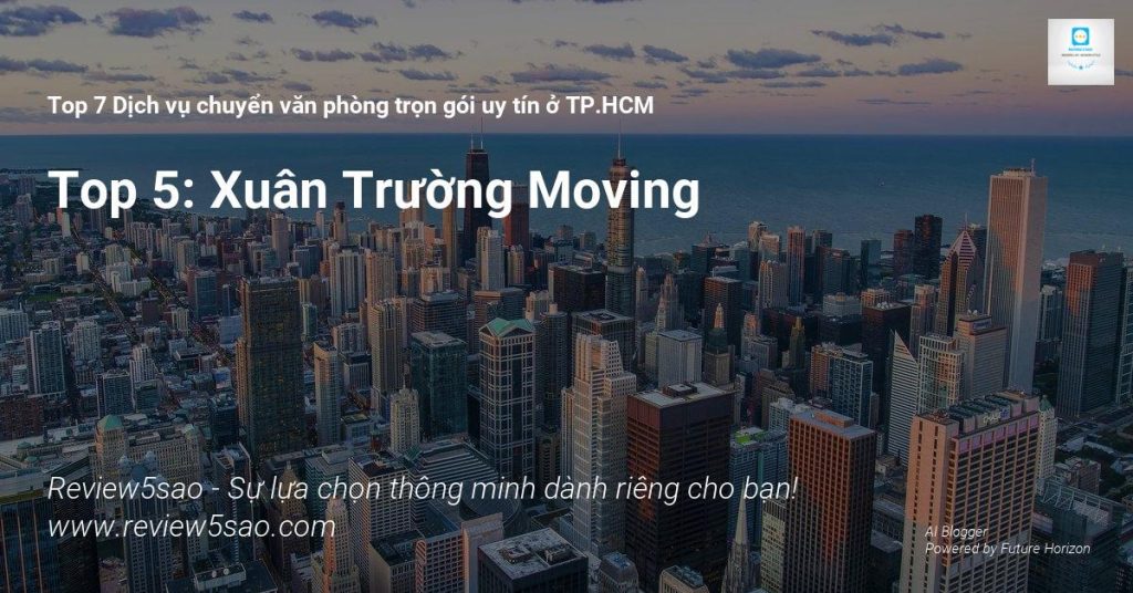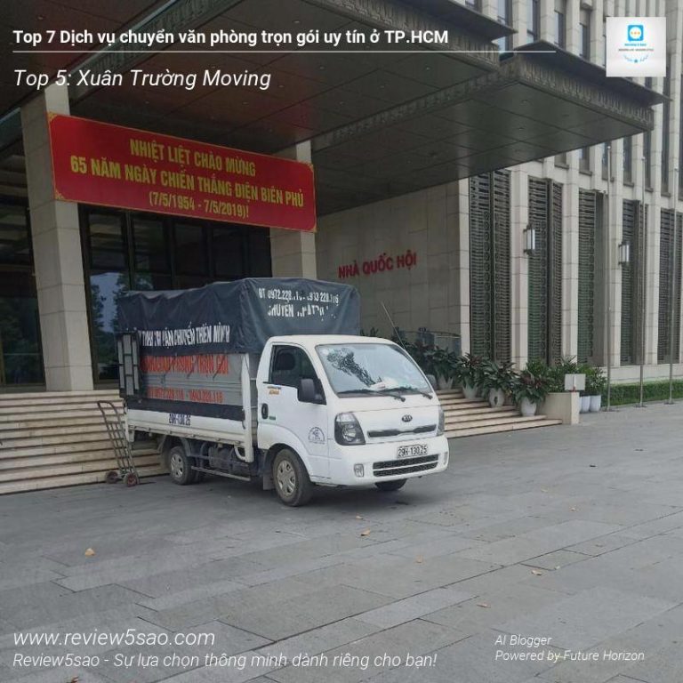 Xuân Trường Moving – Đứng vị trí Top 5 trong danh sách Top 7 Dịch vụ chuyển văn phòng trọn gói uy tín ở TP.HCM trên Review5sao.com, một website chuyên về đánh giá và review sản phẩm dựa trên công nghệ AI từ Future Horizon. Với kinh nghiệm dày dặn và đội ngũ nhân viên chuyên nghiệp, được đào tạo bài bản, Xuân Trường Moving đảm bảo quy trình vận chuyển văn phòng trọn gói an toàn, chuyên nghiệp và hiệu quả.